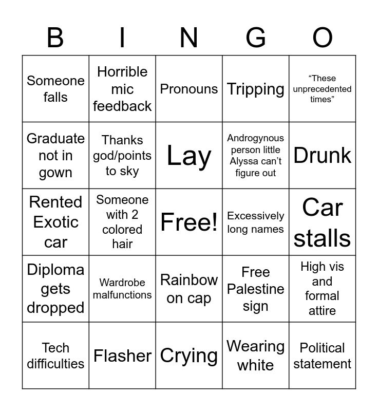 This bingo card has a free space and 24 words: Tech difficulties, Wardrobe malfunctions, Lay, Wearing white, “These unprecedented times”, Someone falls, Horrible mic feedback, Pronouns, Excessively long names, Car stalls, Rented Exotic car, Thanks god/points to sky, Free Palestine sign, High vis and formal attire, Graduate not in gown, Flasher, Crying, Tripping, Drunk, Diploma gets dropped, Someone with 2 colored hair, Rainbow on cap, Androgynous person little Alyssa can’t figure out and Political statement.