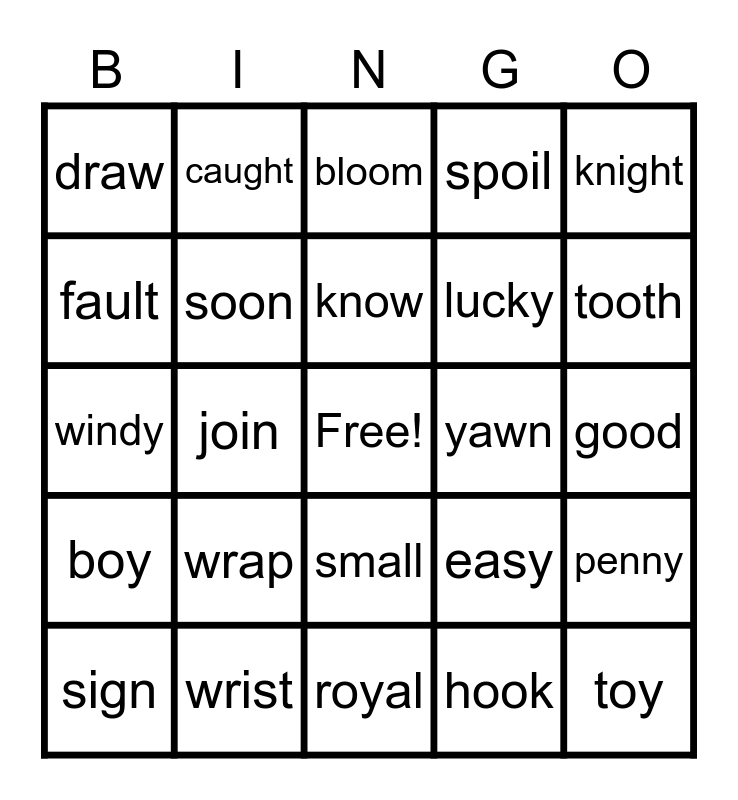 This bingo card has a free space and 24 words: wrap, wrist, know, sign, knight, draw, fault, caught, yawn, small, lucky, windy, easy, penny, soon, hook, good, bloom, tooth, join, toy, boy, spoil and royal.