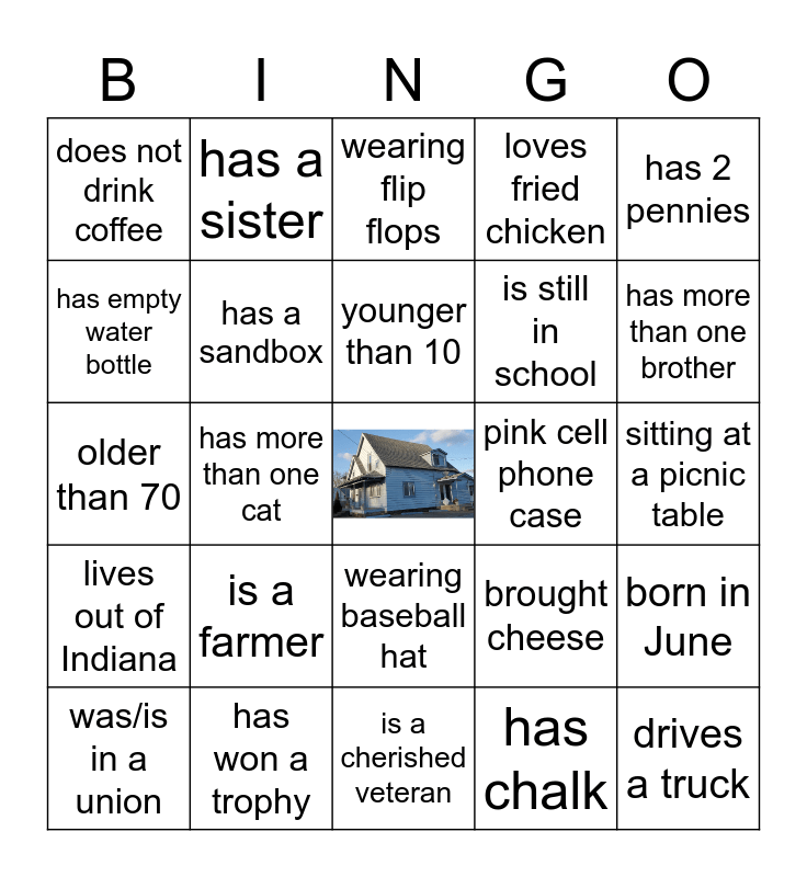 This bingo card has a free space and 24 words: is a farmer, has won a trophy, younger than 10, was/is in a union, has 2 pennies, does not drink coffee, has empty water bottle, has a sister, pink cell phone case, wearing baseball hat, is still in school, older than 70, brought cheese, born in June, has a sandbox, has chalk, sitting at a picnic table, wearing flip flops, has more than one brother, has more than one cat, drives a truck, lives out of Indiana, loves fried chicken and is a cherished veteran.