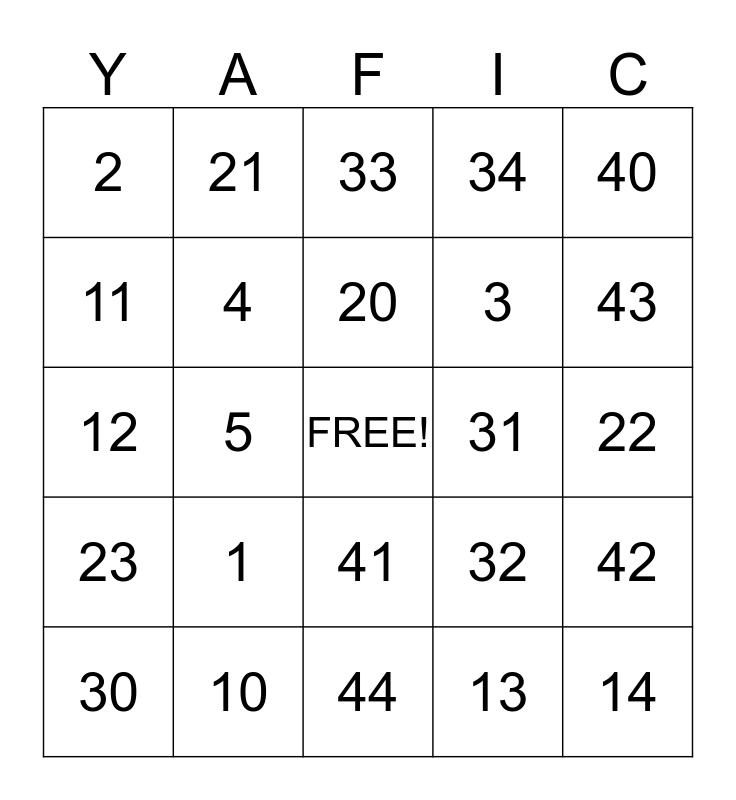 This bingo card has a free space and 24 words: 1, 10, 20, 30, 40, 2, 11, 21, 31, 41, 3, 12, 32, 42, 4, 13, 22, 33, 43, 5, 14, 23, 34 and 44.
