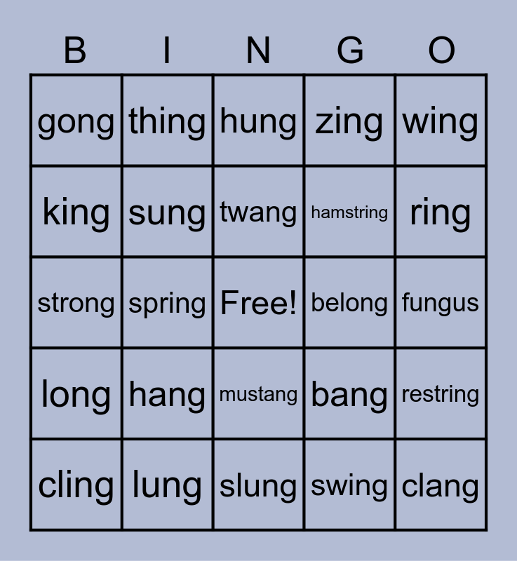 This bingo card has a free space and 24 words: hang, lung, twang, cling, wing, gong, king, thing, belong, mustang, hamstring, strong, bang, restring, sung, swing, fungus, hung, ring, spring, clang, long, zing and slung.