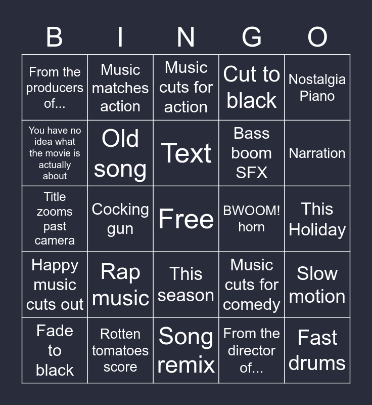 This bingo card has a free space and 24 words: Rap music, Rotten tomatoes score, Text, Fade to black, Nostalgia Piano, From the producers of..., You have no idea what the movie is actually about, Music matches action, BWOOM! horn, This season, Bass boom SFX, Title zooms past camera, Music cuts for comedy, Slow motion, Old song, From the director of..., This Holiday, Music cuts for action, Narration, Cocking gun, Fast drums, Happy music cuts out, Cut to black and Song remix.