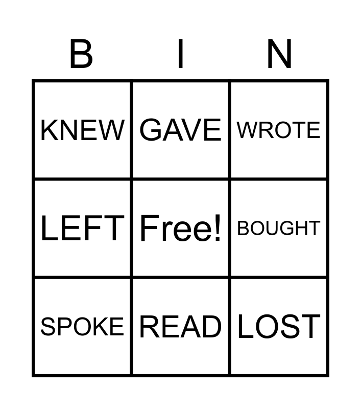 This bingo card has a free space and 17 words: MET, RAN, BOUGHT, KNEW, WENT, LEFT, DROVE, LOST, SPOKE, READ, TOOK, BROKE, GAVE, WROTE, COST, WON and BUILT.