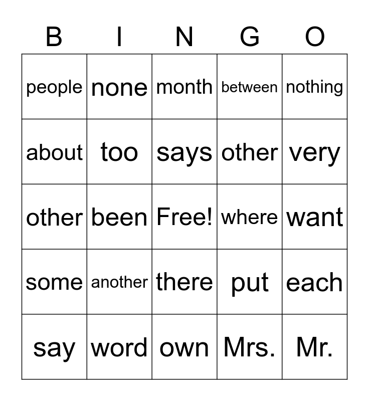This bingo card has a free space and 30 words: word, work, been, little, people, month, too, there, where, own, want, Mr., Mrs., why, very, also, put, some, another, nothing, other, friend, none, other, about, between, each, say, says and our.