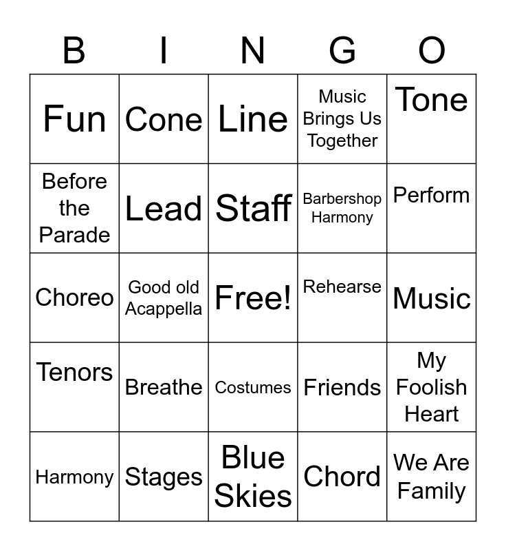 This bingo card has a free space and 34 words: Note, Chord, Baritone, Bass, Tenors, Lead, Tone, Harmony, Cone, Directors, Staff, Line, Sing, Listen, Rehearse, Perform, Stages, Choreo, Breathe, Friends, Costumes, City Voices, Fun, Music, Blue Skies, We Are Family, Music Brings Us Together, Swing Medley, Barbershop Harmony, Before the Parade, A Place in the Choir, Good old Acappella, My Foolish Heart and Happy Together.