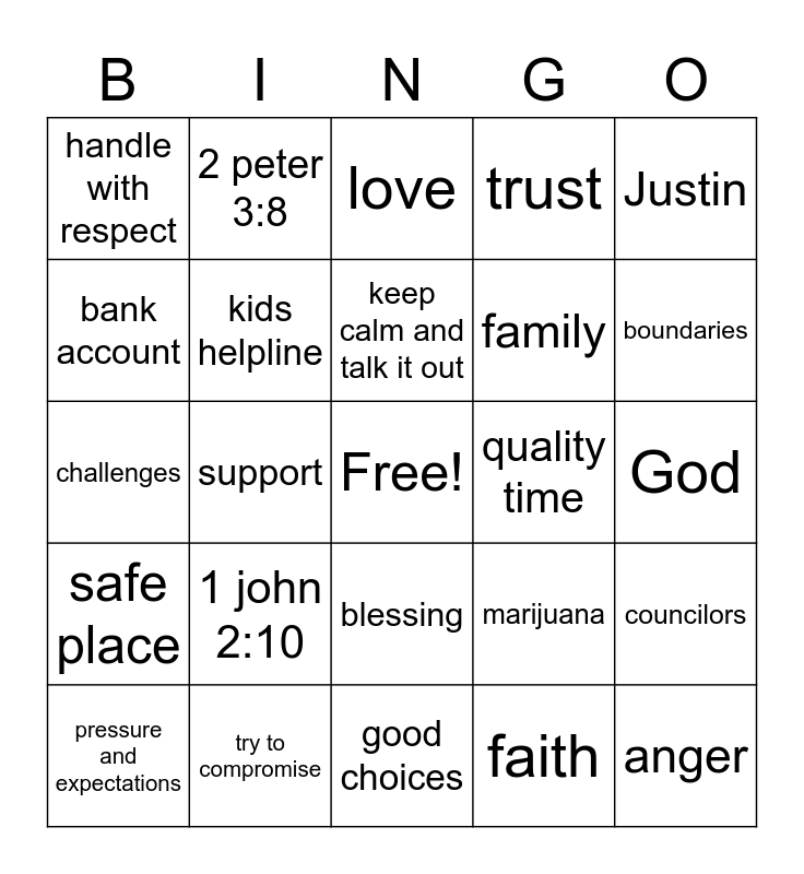 This bingo card has a free space and 24 words: 1 john 2:10, try to compromise, keep calm and talk it out, pressure and expectations, Justin, handle with respect, bank account, 2 peter 3:8, quality time, blessing, family, challenges, marijuana, councilors, kids helpline, faith, God, love, boundaries, support, anger, safe place, trust and good choices.