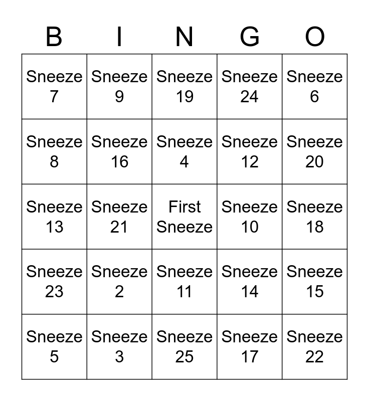 This bingo card has a free space and 24 words: Sneeze 2, Sneeze 3, Sneeze 4, Sneeze 5, Sneeze 6, Sneeze 7, Sneeze 8, Sneeze 9, Sneeze 10, Sneeze 11, Sneeze 12, Sneeze 13, Sneeze 14, Sneeze 15, Sneeze 16, Sneeze 17, Sneeze 18, Sneeze 19, Sneeze 20, Sneeze 21, Sneeze 22, Sneeze 23, Sneeze 24 and Sneeze 25.