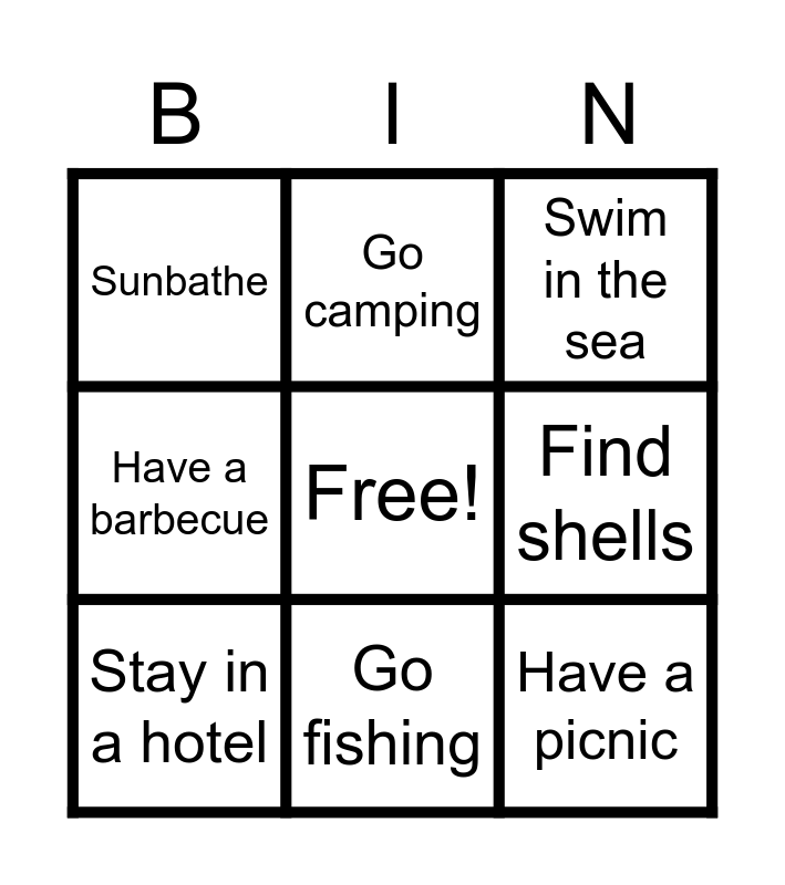 This bingo card has a free space and 10 words: Go fishing, Swim in the sea, Sunbathe, Have a picnic, Have a barbecue, Stay in a hotel, Go camping, Go surfing, Find shells and Make sandcastles.
