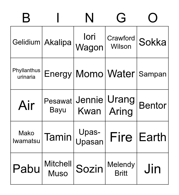 This bingo card has 25 words: Tamin, Sozin, Momo, Pabu, Sokka, Gelidium, Phyllanthus urinaria, Akalipa, Urang Aring, Upas-Upasan, Water, Air, Fire, Earth, Energy, Jin, Bentor, Iori Wagon, Sampan, Pesawat Bayu, Jennie Kwan, Mitchell Muso, Mako Iwamatsu, Crawford Wilson and Melendy Britt.