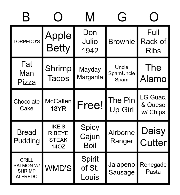 This bingo card has a free space and 24 words: GRILL SALMON W/ SHRIMP ALFREDO, IKE'S RIBEYE STEAK 14OZ, Mayday Margarita, Jalapeno Sausage, Full Rack of Ribs, TORPEDO'S, Apple Betty, Don Julio 1942, The Pin Up Girl, LG Guac. & Queso w/ Chips, Chocolate Cake, Shrimp Tacos, Airborne Ranger, Daisy Cutter, Fat Man Pizza, WMD'S, Spirit of St. Louis, Brownie, The Alamo, Bread Pudding, McCallen 18YR, Spicy Cajun Boil, Uncle SpamUncle Spam and Renegade Pasta.