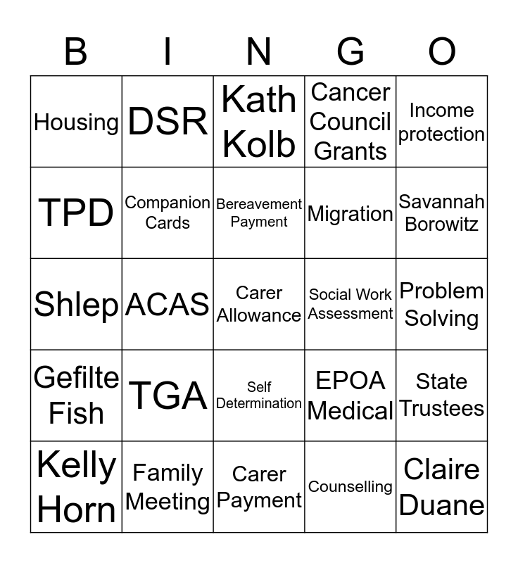 This bingo card has 51 words: DSP, Carer Allowance, Centrelink, Carer Payment, TGA, Will, DSR, EPOA Financial, TPD, MTP, Companion Cards, Cancer Council Grants, State Trustees, EPOA Medical, Guardian ship, Administration, Bereavement Payment, Social Work Assessment, Death Benefit Superannuation, Income protection, ACAS, Counselling, Housing, Migration, MND Palliative Top up Funding, Claire Duane, Savannah Borowitz, Anje Thorburn, Kelly Horn, Kath Kolb, Michelle Bergbauer, Malini Somaiya, Angela Williams, OPA, Family dynamics, Family Meeting, Advocacy, Discharge Planning, Residential care, Community Packages, Problem Solving, Gefilte Fish, Challah, Schmalz, Chicken Soup, Chutzpah, Shlep, Mazel Tov, Empowerment, Self Determination and Social Justice.