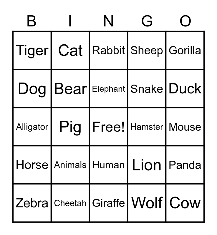This bingo card has a free space and 24 words: Animals, Cheetah, Elephant, Zebra, Gorilla, Tiger, Dog, Cat, Hamster, Human, Snake, Alligator, Lion, Panda, Bear, Wolf, Mouse, Rabbit, Duck, Pig, Cow, Horse, Sheep and Giraffe.