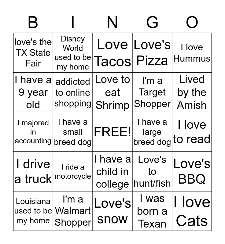 This bingo card has a free space and 24 words: I ride a motorcycle, I'm a Walmart Shopper, Love to eat Shrimp, Louisiana used to be my home, I love Hummus, love's the TX State Fair, I have a 9 year old, Disney World used to be my home, I have a large breed dog, I have a child in college, I'm a Target Shopper, I majored in accounting, Love's to hunt/fish, Love's BBQ, addicted to online shopping, I was born a Texan, I love to read, Love Tacos, Lived by the Amish, I have a small breed dog, I love Cats, I drive a truck, Love's Pizza and Love's snow.