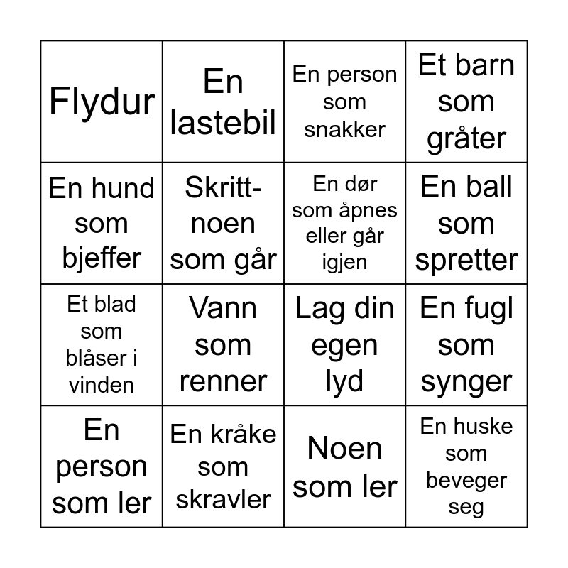 This bingo card has 20 words: En fugl som synger, Noen som skriker, En person som snakker, Blåsende vind, En person som ler, En hund som bjeffer, En kråke som skravler, Flydur, Et blad som blåser i vinden, En lastebil, Vann som renner, Lag din egen lyd, Skritt-noen som går, En huske som beveger seg, En dør som åpnes eller går igjen, En bil som kjører, En ball som spretter, Et barn som gråter, Noen som ler and To personer som snakker sammen.