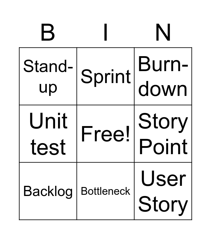 This bingo card has a free space and 8 words: Story Point, Burn-down, Sprint, Backlog, Stand-up, User Story, Unit test and Bottleneck.