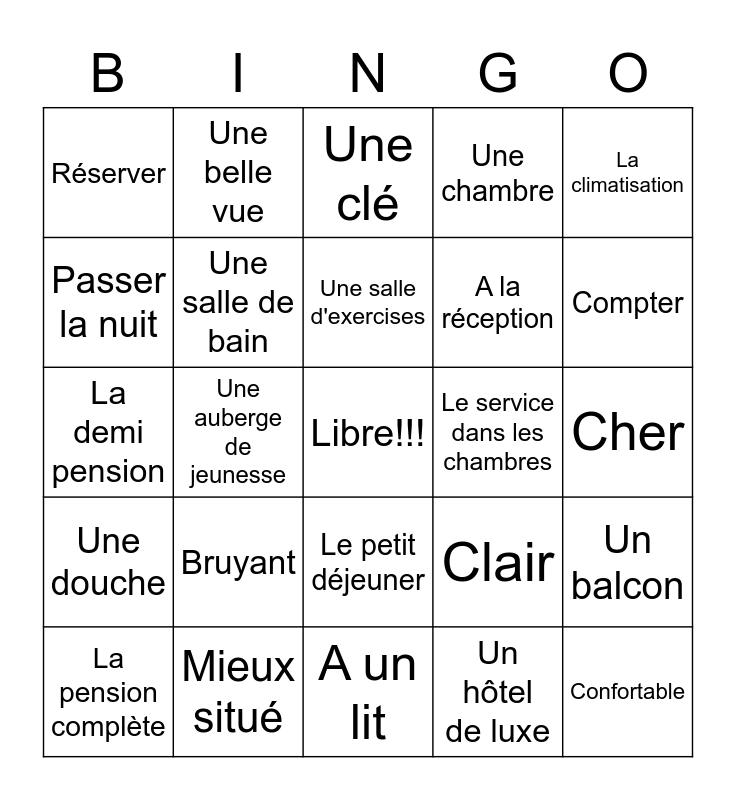 This bingo card has a free space and 32 words: Un hôtel de luxe, Une auberge, Une auberge de jeunesse, Loger, Une douche, Une salle de bain, La climatisation, Un balcon, Une belle vue, En especes, Une salle d'exercises, Une clé, Une carte de crédit, Une piscine, Le service dans les chambres, Un ascenseur, La pension complète, La demi pension, Le petit déjeuner, Bruyant, Clair, Spacieux Spacieuse, Cher, Mieux situé, Confortable, Une chambre, A la réception, Passer la nuit, Réserver, A un lit, A deux lits and Compter.