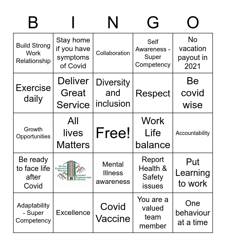 This bingo card has 1 images, a free space and 23 words: Excellence, Diversity and inclusion, Adaptability - Super Competency, No vacation payout in 2021, Build Strong Work Relationship, Exercise daily, Stay home if you have symptoms of Covid, Work Life balance, Mental Illness awareness, Respect, Growth Opportunities, Report Health & Safety issues, Put Learning to work, Deliver Great Service, You are a valued team member, Accountability, Collaboration, Be covid wise, All lives Matters, One behaviour at a time, Be ready to face life after Covid, Self Awareness - Super Competency and Covid Vaccine.