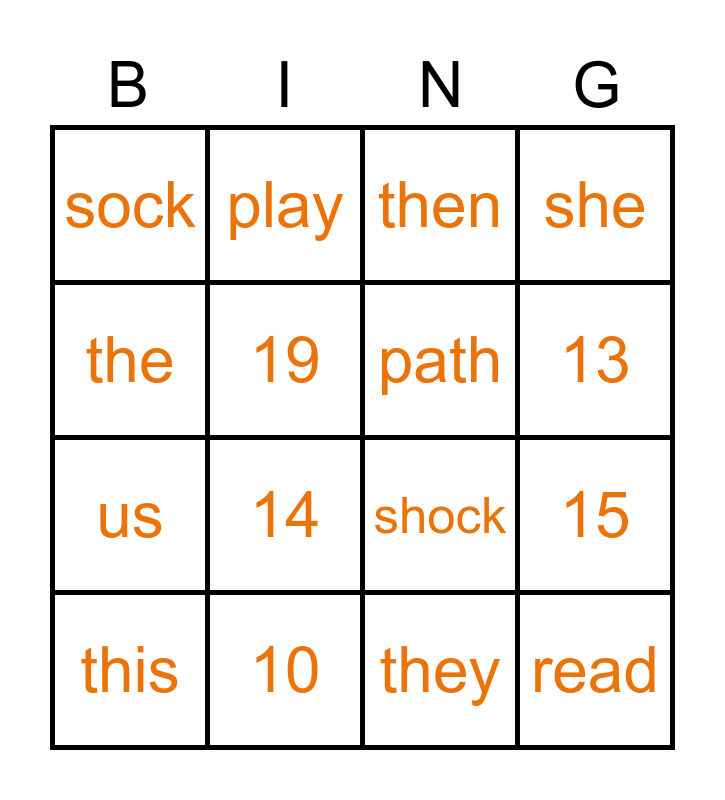 This bingo card has 25 words: shut, such, 13, and, the, sock, 19, play, 10, 12, us, shock, 20, chin, path, 11, they, then, 14, 15, this, out, read, she and girl.