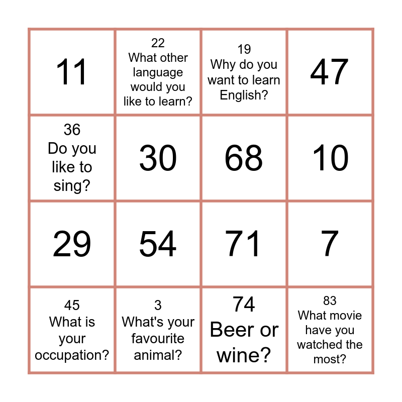 This bingo card has 16 words: 3 What's your favourite animal?, 7, 19 Why do you want to learn English?, 11, 29, 22 What other language would you like to learn?, 71, 74 Beer or wine?, 36 Do you like to sing?, 30, 45 What is your occupation?, 47, 54, 10, 68 and 83 What movie have you watched the most?.