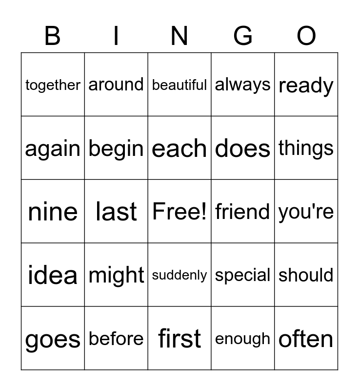 This bingo card has a free space and 24 words: might, before, each, goes, ready, together, again, around, friend, suddenly, does, nine, special, should, begin, enough, you're, beautiful, things, last, often, idea, always and first.