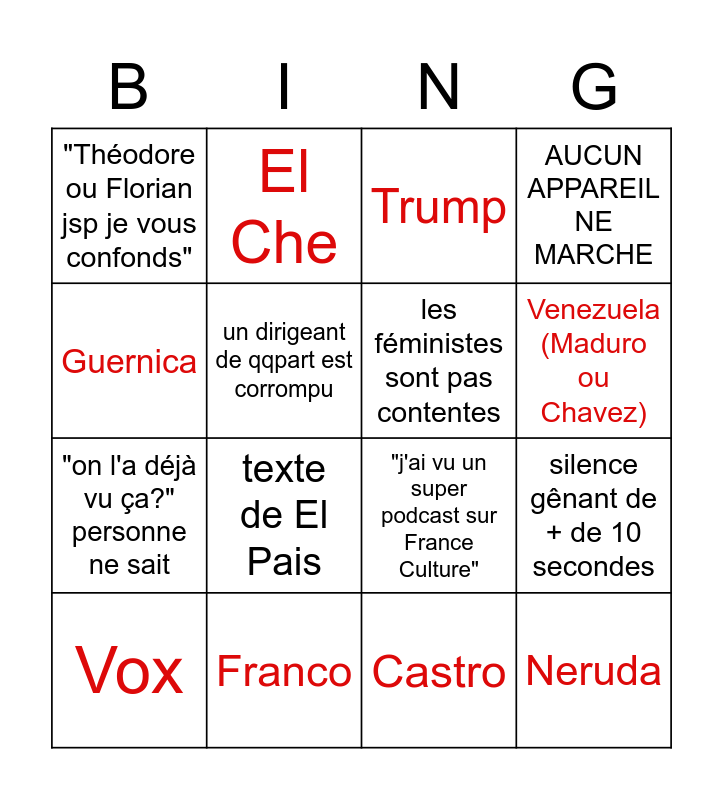 This bingo card has 16 words: Franco, silence gênant de + de 10 secondes, Trump, "Théodore ou Florian jsp je vous confonds", "on l'a déjà vu ça?" personne ne sait, El Che, "j'ai vu un super podcast sur France Culture", Castro, Guernica, un dirigeant de qqpart est corrompu, Vox, AUCUN APPAREIL NE MARCHE, texte de El Pais, Venezuela (Maduro ou Chavez), les féministes sont pas contentes and Neruda.