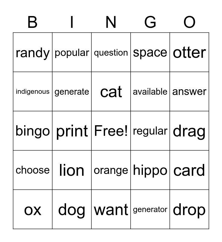 This bingo card has a free space and 24 words: lion, dog, cat, ox, otter, randy, indigenous, popular, regular, orange, available, bingo, hippo, card, generate, generator, drag, question, answer, print, drop, choose, space and want.