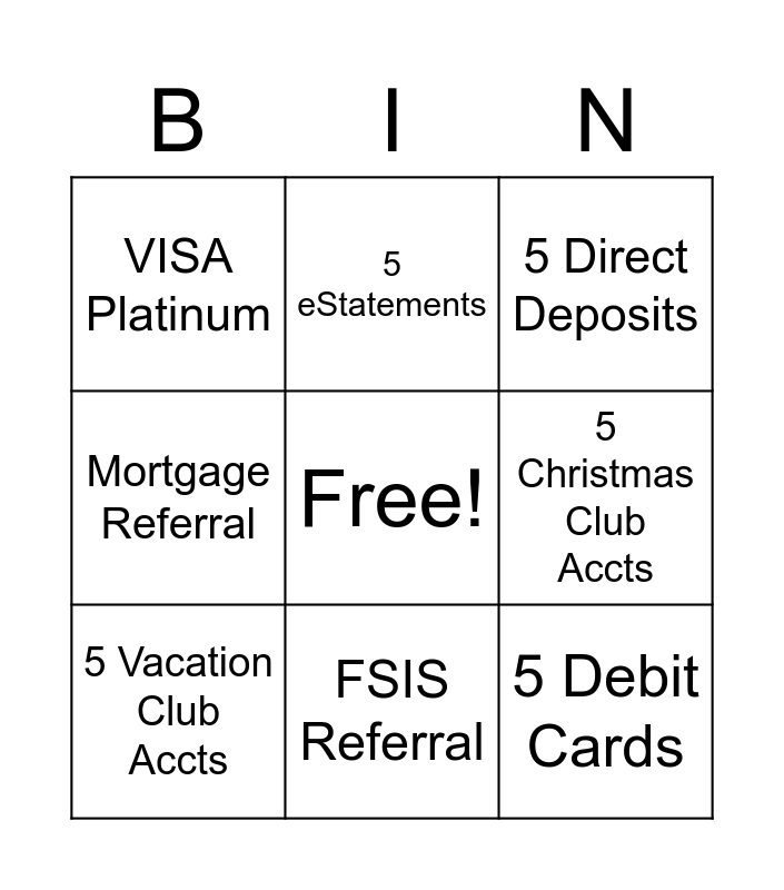 This bingo card has a free space and 8 words: Mortgage Referral, 5 eStatements, 5 Christmas Club Accts, 5 Vacation Club Accts, 5 Direct Deposits, VISA Platinum, FSIS Referral and 5 Debit Cards.
