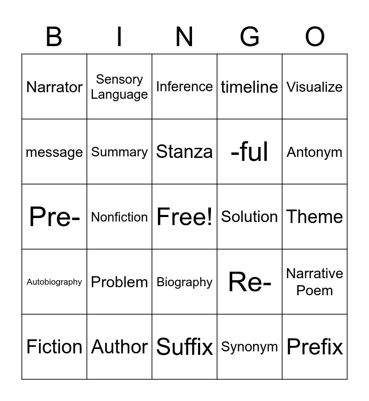 This bingo card has a free space and 29 words: Fiction, Realistic Fiction, Nonfiction, Setting, Narrator, Inference, Summary, Problem, Solution, Author, Theme, Prefix, Suffix, Synonym, Antonym, Main Idea, Biography, Autobiography, Visualize, Pre-, Re-, -less, -ful, message, timeline, Sensory Language, Narrative Poem, Stanza and Onomatopoeia.
