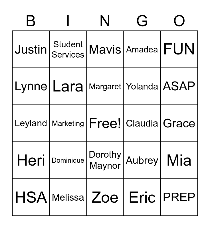 This bingo card has a free space and 24 words: Dominique, Melissa, Margaret, HSA, FUN, Justin, Lynne, Student Services, Claudia, Dorothy Maynor, Yolanda, Leyland, Aubrey, Mia, Lara, Eric, Grace, Mavis, ASAP, Marketing, PREP, Heri, Amadea and Zoe.