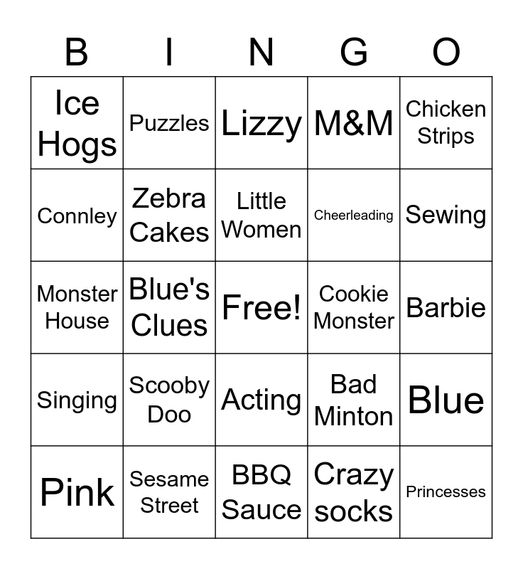This bingo card has a free space and 24 words: Scooby Doo, Sesame Street, Little Women, Pink, Chicken Strips, Ice Hogs, Connley, Puzzles, Cookie Monster, Acting, Cheerleading, Monster House, Bad Minton, Blue, Zebra Cakes, Crazy socks, Barbie, Lizzy, Sewing, Blue's Clues, Princesses, Singing, M&M and BBQ Sauce.