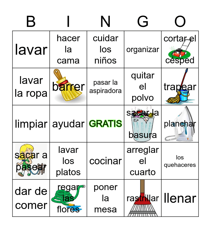 This bingo card has 9 images, a free space and 25 words: lavar los platos, poner la mesa, pasar la aspiradora, dar de comer, cortar el césped, lavar, lavar la ropa, hacer la cama, sacar la basura, cocinar, quitar el polvo, limpiar, arreglar el cuarto, los quehaceres, barrer, traspalar la nieve, planchar, cuidar los niños, trapear, ayudar, llenar, regar las flores, sacar a pasear, organizar and rastrillar.