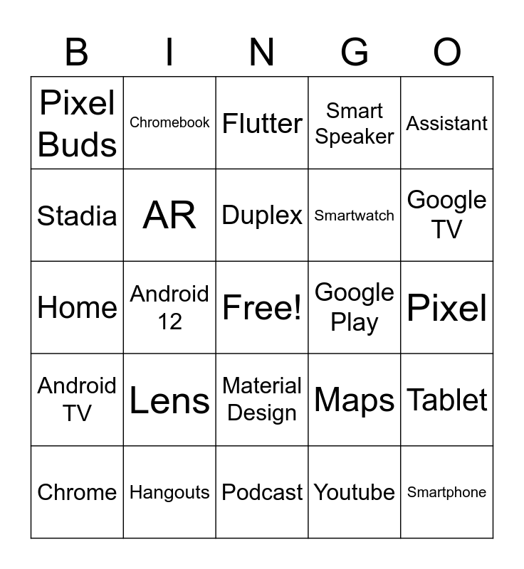This bingo card has a free space and 33 words: Google IO, Angular, Android 12, Android Auto, Android TV, AR, Assistant, Chrome, Chromebook, Chormecast, Duplex, Flutter, Fuchsia, Google Pay, Google Play, Google TV, Hangouts, Home, Lens, Maps, Material Design, Nest, Pixel Buds, Pixel, Podcast, Smartphone, Smart Speaker, Smartwatch, Stadia, Tablet, Tensorflow, Youtube and Wear OS.