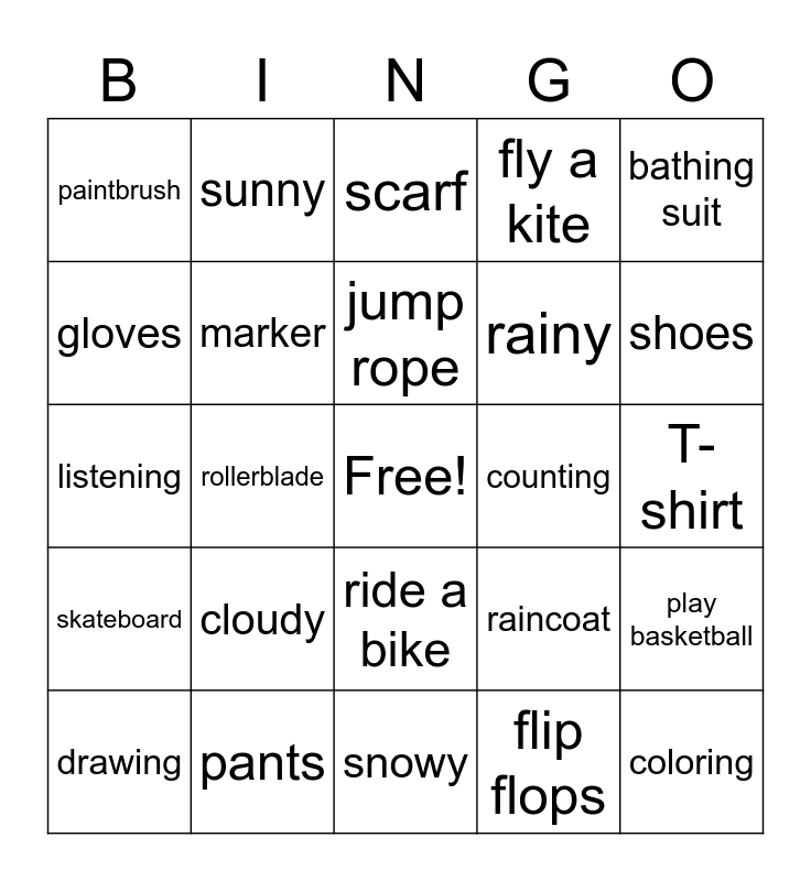 This bingo card has a free space and 24 words: cloudy, pants, jump rope, drawing, bathing suit, paintbrush, gloves, sunny, counting, ride a bike, rainy, listening, raincoat, play basketball, marker, flip flops, T-shirt, scarf, shoes, rollerblade, coloring, skateboard, fly a kite and snowy.
