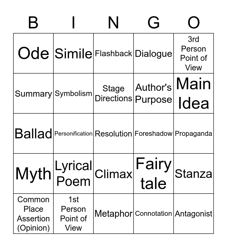 This bingo card has a free space and 43 words: Protagonist, Antagonist, Inference, Common Place Assertion (Opinion), Factual Claim (Fact), Connotation, Flashback, Narrator, 3rd Person Point of View, 1st Person Point of View, Dialogue, Foreshadow, Climax, Lyrical Poem, Irony, Metaphor, Falling Action, Ballad, Narrative Poem, Main Idea, Simile, Rising Action, Free Verse Poem, Ode, Persuasive Techniques, Propaganda, Tone, Imagery, Fairy tale, Myth, Theme, Stanza, Exposition, Personification, Hyperbole, Alliteration, Conflict, Stage Directions, Summary, Author's Purpose, Memoir, Symbolism and Biography.