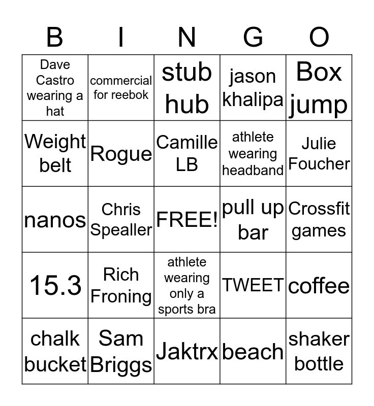 This bingo card has a free space and 24 words: Rich Froning, Sam Briggs, Camille LB, chalk bucket, Box jump, Dave Castro wearing a hat, Weight belt, commercial for reebok, pull up bar, athlete wearing only a sports bra, athlete wearing headband, nanos, TWEET, coffee, Rogue, beach, Crossfit games, stub hub, Julie Foucher, Chris Spealler, shaker bottle, 15.3, jason khalipa and Jaktrx.