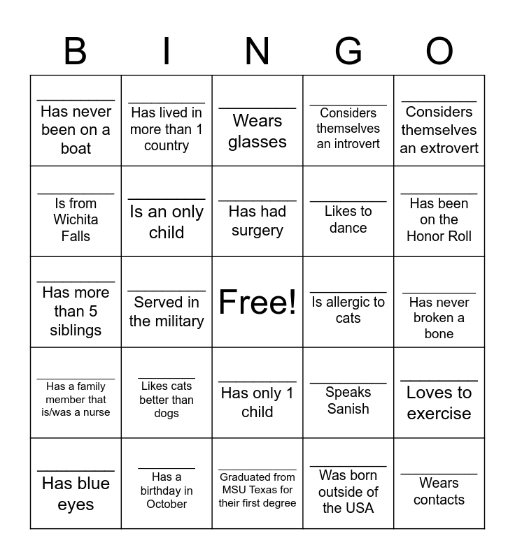 This bingo card has a free space and 24 words: _________ Likes cats better than dogs, _________ Has a birthday in October, _________ Has had surgery, ________ Has blue eyes, _________ Considers themselves an extrovert, _________ Has never been on a boat, __________ Is from Wichita Falls, __________ Has lived in more than 1 country, __________ Is allergic to cats, _________ Has only 1 child, __________ Likes to dance, _________ Has more than 5 siblings, __________ Speaks Sanish, ________ Loves to exercise, ________ Is an only child, __________ Was born outside of the USA, __________ Has never broken a bone, ________ Wears glasses, __________ Has been on the Honor Roll, _________ Served in the military, __________ Wears contacts, _____________ Has a family member that is/was a nurse, ___________ Considers themselves an introvert and _____________ Graduated from MSU Texas for their first degree.