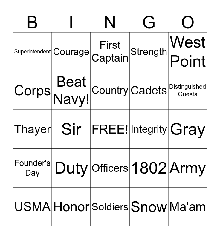 This bingo card has a free space and 24 words: Duty, Honor, Country, USMA, West Point, Superintendent, Corps, Courage, Integrity, Officers, Cadets, Thayer, 1802, Army, Beat Navy!, Snow, Gray, First Captain, Distinguished Guests, Sir, Ma'am, Founder's Day, Strength and Soldiers.