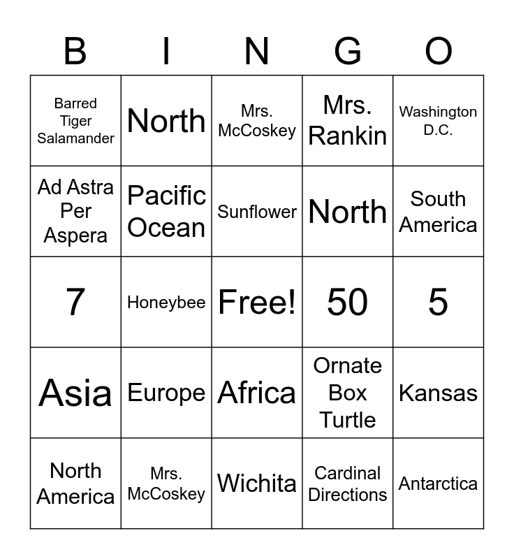 This bingo card has a free space and 24 words: Europe, Mrs. McCoskey, Sunflower, North America, Washington D.C., Barred Tiger Salamander, Ad Astra Per Aspera, North, 50, Africa, North, 7, Ornate Box Turtle, Kansas, Pacific Ocean, Cardinal Directions, 5, Mrs. McCoskey, South America, Honeybee, Antarctica, Asia, Mrs. Rankin and Wichita.