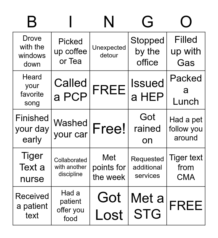 This bingo card has a free space and 24 words: Received a patient text, Collaborated with another discipline, FREE, Met a STG, Filled up with Gas, Drove with the windows down, Picked up coffee or Tea, Unexpected detour, Got rained on, Had a pet follow you around, Finished your day early, Called a PCP, Requested additional services, Tiger text from CMA, Heard your favorite song, Had a patient offer you food, Got Lost, Stopped by the office, Packed a Lunch, Tiger Text a nurse, Washed your car, Met points for the week, Issued a HEP and FREE.