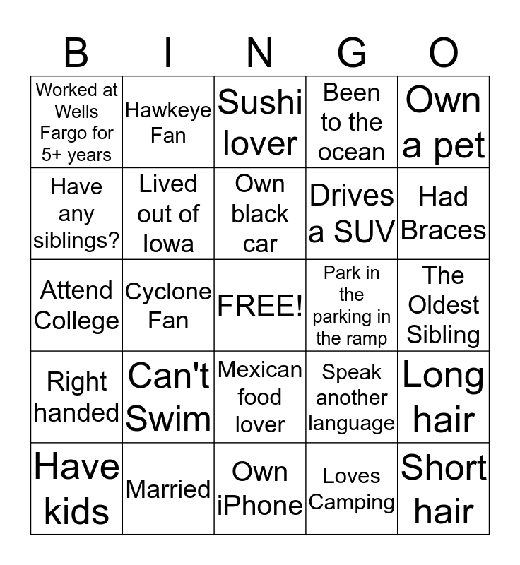 This bingo card has a free space and 24 words: Can't Swim, Married, Own black car, Have kids, Own a pet, Worked at Wells Fargo for 5+ years, Have any siblings?, Hawkeye Fan, Park in the parking in the ramp, Mexican food lover, Drives a SUV, Attend College, Speak another language, Long hair, Lived out of Iowa, Loves Camping, The Oldest Sibling, Sushi lover, Had Braces, Cyclone Fan, Short hair, Right handed, Been to the ocean and Own iPhone.