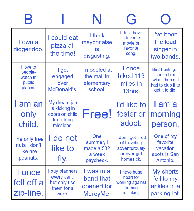 This bingo card has a free space and 35 words: I starred in a movie., I flew to Europe by myself., I started working when I was 15., I got engaged over McDonald’s., One summer, I made a $32 a week paycheck., I don't have a favorite movie or favorite song., I love to people-watch in public places., I love musicals and have been on stage for a BR Little Theatre performance., I modeled at the mall in elementary school., I played the lead role in my kindergarten play., I am an only child., I've been the lead singer in two bands., I've never broken a bone., Before moving to LA, MS was as far west as I had ever traveled., I own a didgeridoo., I'd like to foster or adopt., I have huge heart for working against human trafficking., My dream job is kicking in doors on child trafficking missions., The only tree nuts I don't like are peanuts., My shorts fell to my ankles in a parking lot., I don't get tired of traveling adventurously or ever get homesick., I once fell off a zip-line., One of my favorite vacation spots is San Antonio., I buy planners every Jan., but only use them for a week., I think mayonnaise is disgusting., Bird hunting, I shot a bird twice, then still had to club it to get it to die., I don't like horror movies., I have been skydiving., I once biked 113 miles in 13hrs., I am a morning person., I do not like rollercoasters., I was in a band that opened for MercyMe., I do not like to fly., I could eat pizza all the time! and I have my Master's degree and still don't know how to properly format a paper..