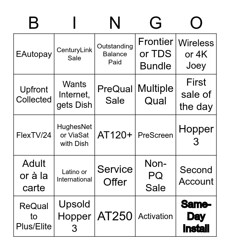This bingo card has 25 words: Latino or International, AT250, PreQual Sale, ReQual to Plus/Elite, Wireless or 4K Joey, EAutopay, Upfront Collected, CenturyLink Sale, PreScreen, Service Offer, Multiple Qual, FlexTV/24, Non-PQ Sale, Second Account, Wants Internet, gets Dish, Same-Day Install, Hopper 3, Outstanding Balance Paid, First sale of the day, HughesNet or ViaSat with Dish, AT120+, Upsold Hopper 3, Adult or à la carte, Frontier or TDS Bundle and Activation.