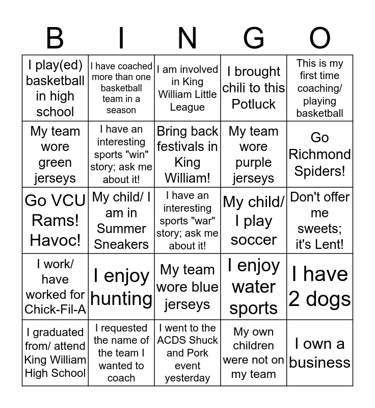 This bingo card has a free space and 24 words: I enjoy hunting, I requested the name of the team I wanted to coach, Bring back festivals in King William!, I graduated from/ attend King William High School, This is my first time coaching/ playing basketball, I play(ed) basketball in high school, My team wore green jerseys, I have coached more than one basketball team in a season, My child/ I play soccer, My team wore blue jerseys, My team wore purple jerseys, Go VCU Rams! Havoc!, I enjoy water sports, I have 2 dogs, I have an interesting sports "win" story; ask me about it!, My own children were not on my team, Don't offer me sweets; it's Lent!, I am involved in King William Little League, Go Richmond Spiders!, My child/ I am in Summer Sneakers, I own a business, I work/ have worked for Chick-Fil-A, I brought chili to this Potluck and I went to the ACDS Shuck and Pork event yesterday.
