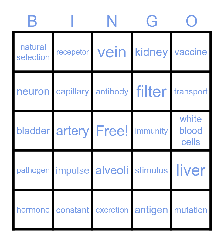 This bingo card has a free space and 24 words: impulse, constant, antibody, hormone, vaccine, natural selection, neuron, recepetor, immunity, alveoli, filter, bladder, stimulus, liver, capillary, antigen, white blood cells, vein, transport, artery, mutation, pathogen, kidney and excretion.
