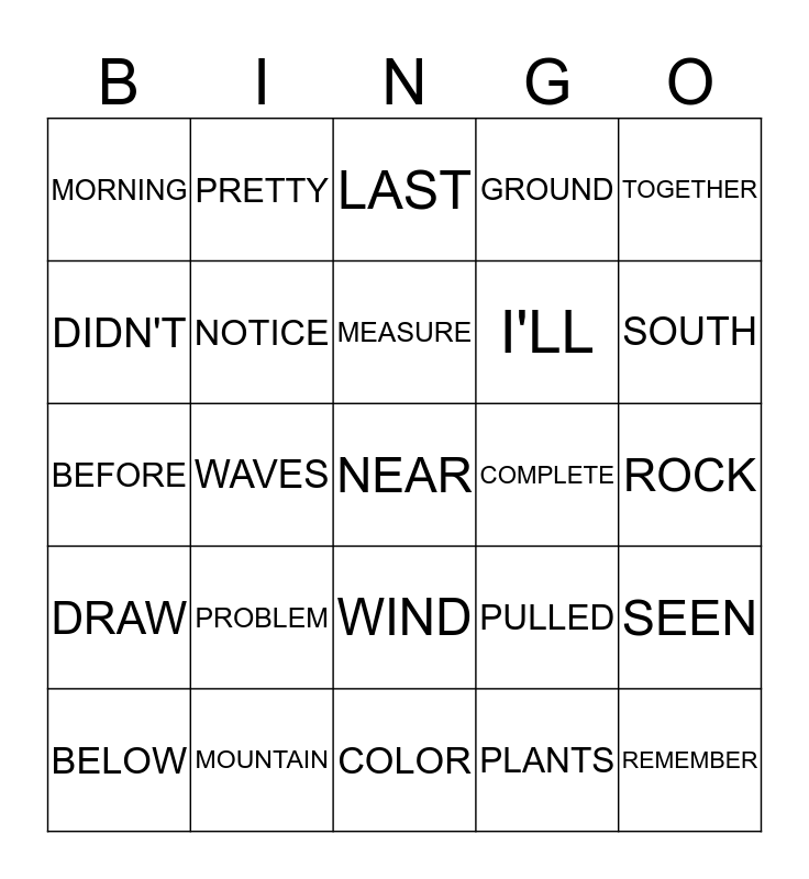 This bingo card has 45 words: HIGH, NEAR, BETWEEN, BELOW, COUNTRY, PLANTS, LAST, SCHOOL, TOGETHER, MOUNTAIN, GROUND, COMPLETE, WIND, PROBLEM, QUESTION, COLOR, AFTER, BEFORE, THINK, SOUTH, PRETTY, SECOND, FAMILY, MORNING, LISTEN, ROCK, PAPER, SCISSORS, PULLED, DRAW, VOICE, SEEN, COLD, CRIED, SPACE, WAVES, REACH, EARLY, REMEMBER, MEASURE, DIDN'T, I'LL, KING SING, NOTICE and PLAN.