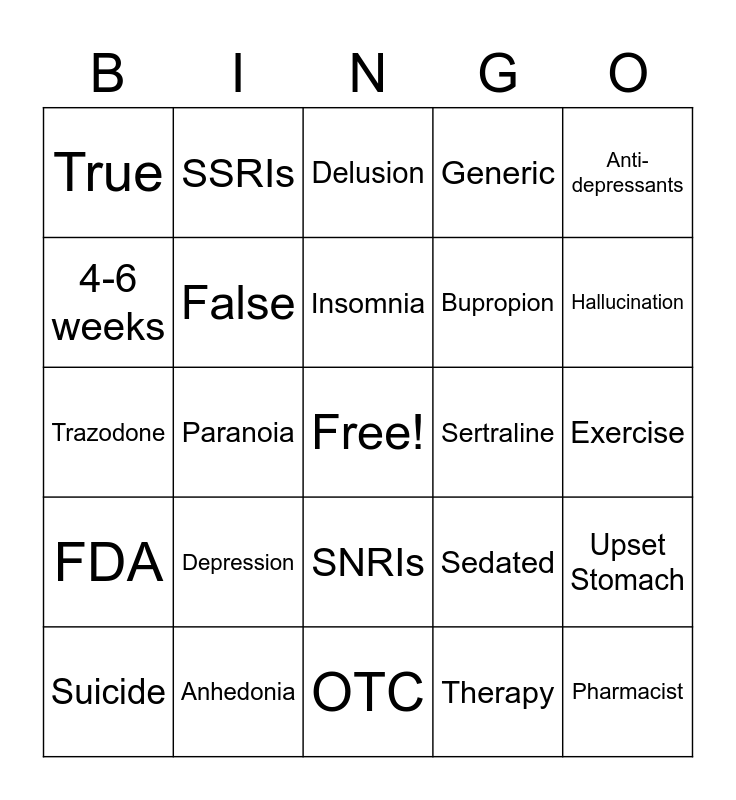 This bingo card has a free space and 24 words: Depression, Anhedonia, Insomnia, Suicide, Anti-depressants, True, 4-6 weeks, SSRIs, Sertraline, SNRIs, Bupropion, Trazodone, Sedated, Upset Stomach, False, Therapy, Exercise, Delusion, Hallucination, Paranoia, Pharmacist, FDA, Generic and OTC.