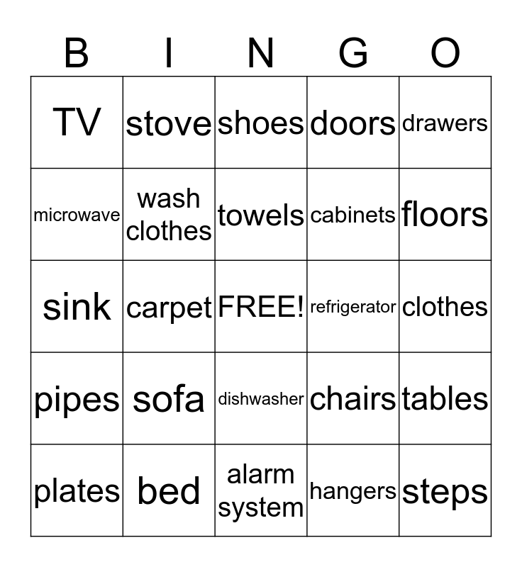 This bingo card has a free space and 24 words: sofa, bed, towels, plates, drawers, TV, microwave, stove, refrigerator, dishwasher, cabinets, sink, chairs, tables, wash clothes, hangers, clothes, shoes, floors, carpet, steps, pipes, doors and alarm system.