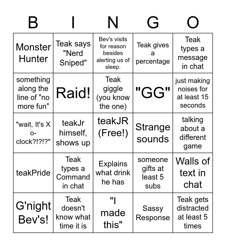 This bingo card has a free space and 34 words: Takes a "joke" seriously, Sassy Response, Hard Tangent, Accepting of everyone, teakPride, Raid!, Teak types a message in chat, G'night Bev's!, Teak says "Nerd Sniped", "Thats a song by Trop's 'N Trop's", Teak giggle (you know the one), Bev's visits for reason besides alerting us of sleep., the BRB logo does NOT move, the BRB logo DOES move, Strange sounds, just making noises for at least 15 seconds, Teak doesn't know what time it is, "wait, It's X o-clock?!?!?", Teak types a Command in chat, someone gifts at least 5 subs, Explains what drink he has, Distracted from game for a solid 5 minutes, Monster Hunter, talking about a different game, "I made this", Teak gets distracted at least 5 times, Teak gives a percentage, Confused teak noises, "GG", something along the line of "no more fun", teakPaint, teakJr himself, shows up, Walls of text in chat and Teak messes with the stream.