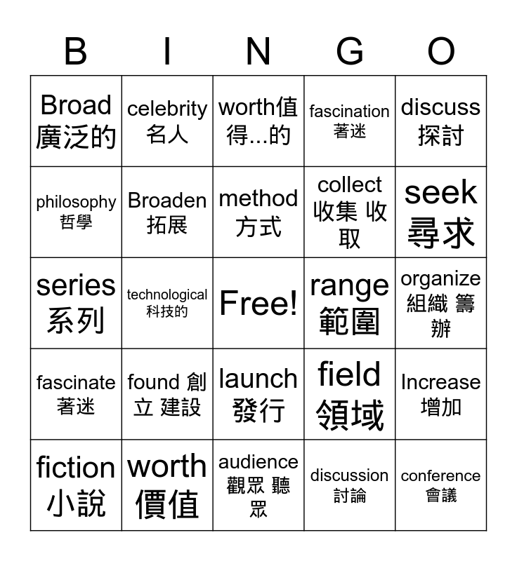 This bingo card has a free space and 25 words: found 創立 建設, audience 觀眾 聽眾, method 方式, fiction 小說, discuss 探討, Broad 廣泛的, philosophy 哲學, celebrity 名人, range 範圍, launch發行, collect 收集 收取, series 系列, field領域, Increase增加, Broaden 拓展, numerous 許多的, organize組織 籌辦, worth值得...的, seek 尋求, technological科技的, conference 會議, worth 價值, fascinate 著迷, fascination 著迷 and discussion討論.