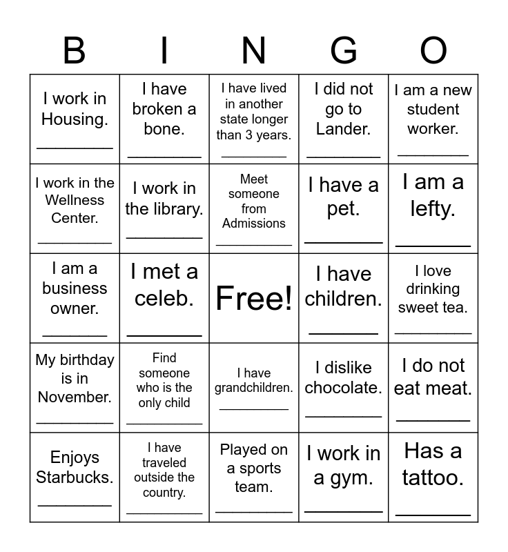 This bingo card has a free space and 24 words: Find someone who is the only child ___________, I have traveled outside the country. ___________, Meet someone from Admissions ___________, Enjoys Starbucks. ________, I am a new student worker. ________, I work in Housing. ________, I work in the Wellness Center. _________, I have broken a bone. ________, I have children. ______, I have grandchildren. __________, I have a pet. _______, I am a business owner. _______, I dislike chocolate. ________, I do not eat meat. _______, I work in the library. ________, I work in a gym. _______, I love drinking sweet tea. _________, I have lived in another state longer than 3 years. _________, I am a lefty. ______, I met a celeb. ______, Has a tattoo. ______, My birthday is in November. _________, I did not go to Lander. ________ and Played on a sports team. _________.